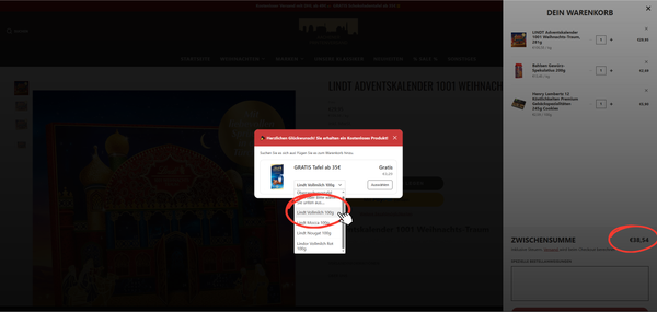 Sobald du einen Warenwert von 35 € erreichst, erscheint automatisch ein Pop-up. Bitte nicht wegklicken – einfach im Auswahlmenü eine Tafel auswählen.