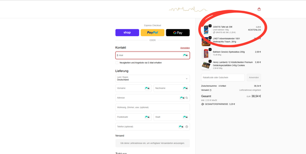Wenn du alles ausgewählt hast und der Betrag weiterhin über 35 € liegt, kannst du mit deiner Gratis-Tafel ganz normal auschecken. 😊